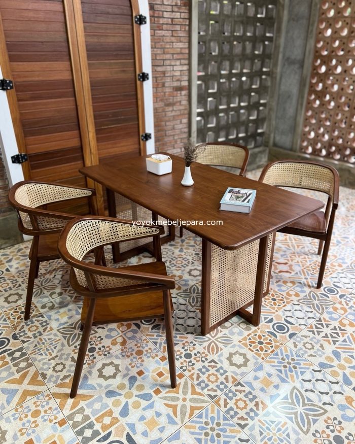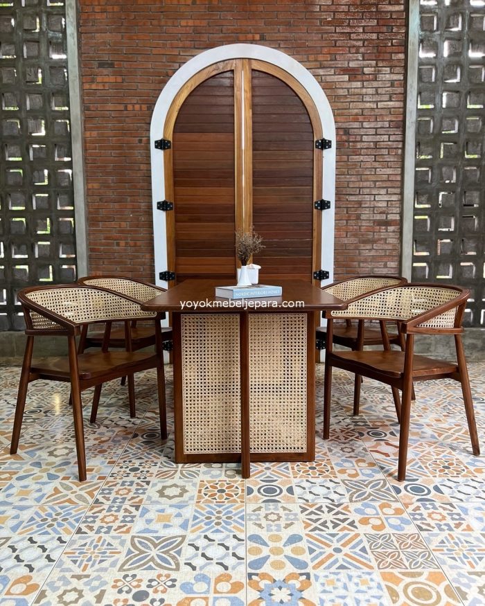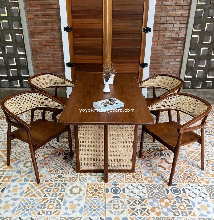 Set Meja Makan Minimalis 4 Kursi Kayu Jati Kombinasi Rotan YMJ-SKM 218